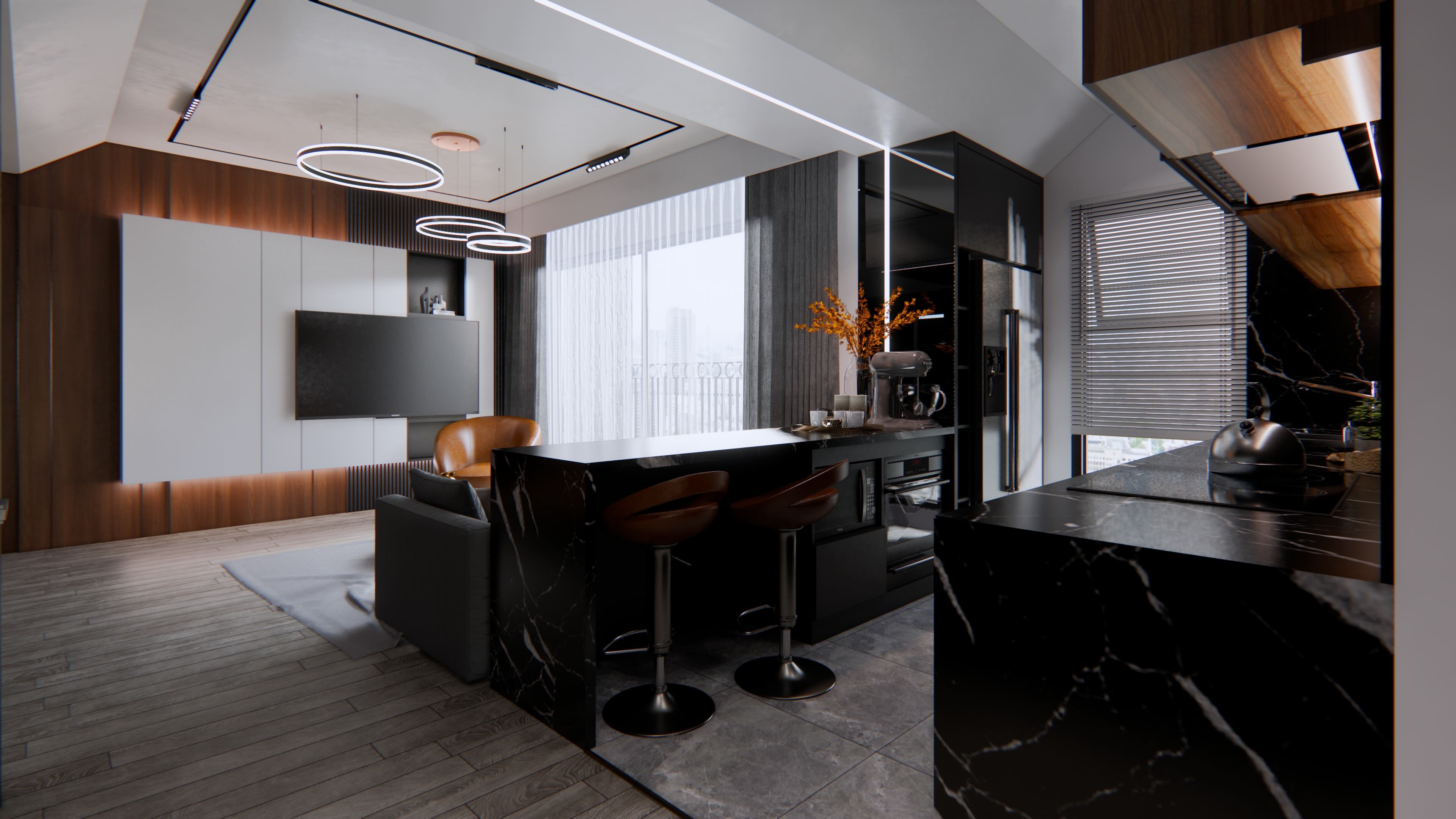 Đảo bếp ốp đá đen sang trọng phân chia không gian công trình, kết hợp hệ tủ gỗ óc chó ấm áp phía trên và ghế bar da cam.