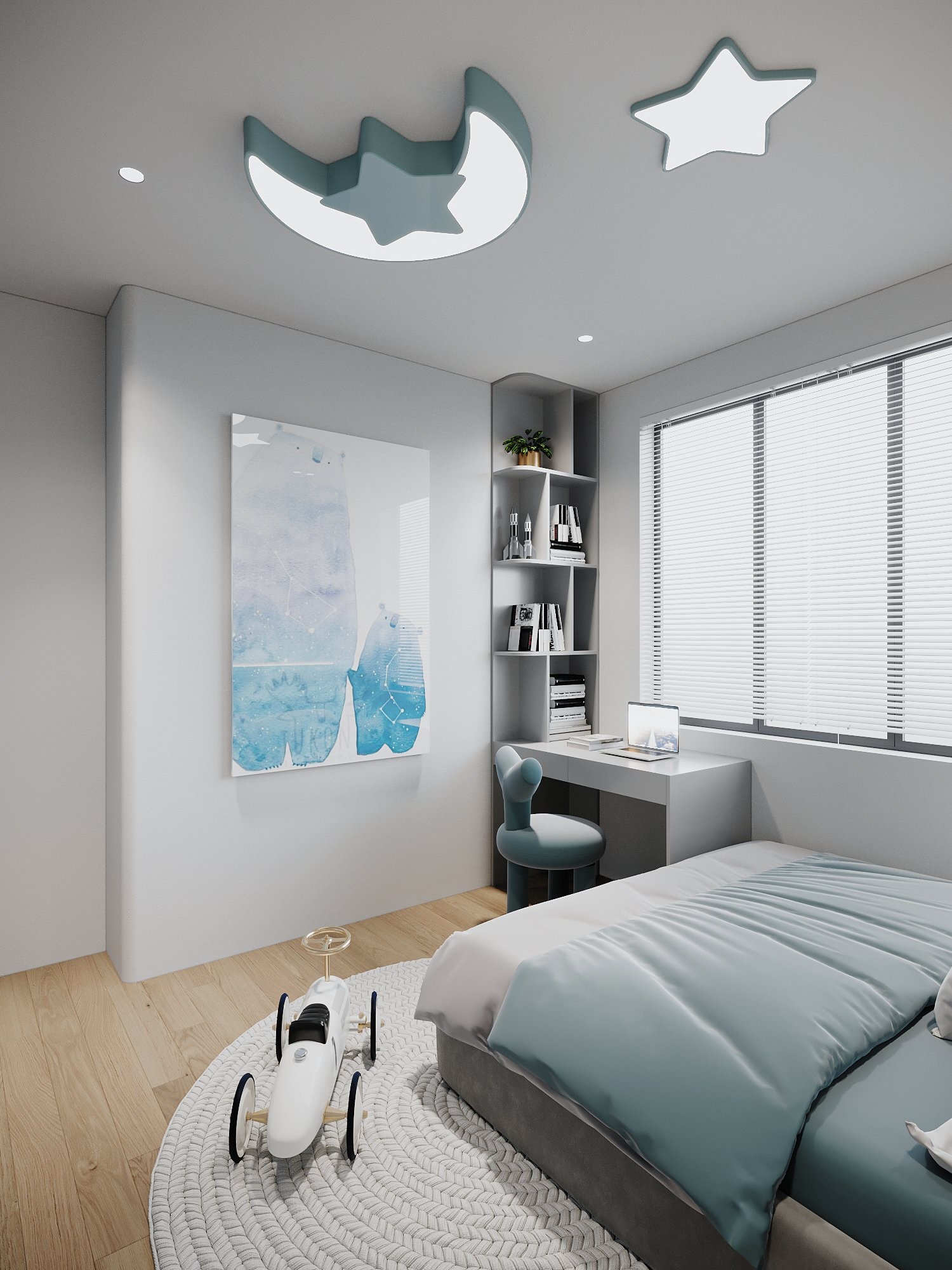 Với tone màu xanh dương nhạt - xám chủ đạo, thiết kế này vừa tinh tế, hiện đại, vừa phù hợp với bé nhỏ trong gia đình.