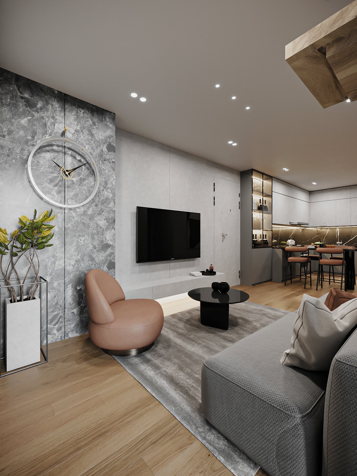 Thiết kế nội thất của phòng khách mang phong cách Hiện đại tối giản , với sự tập trung vào các đường nét sạch sẽ, màu sắc trung tính và vật liệu cao cấp.