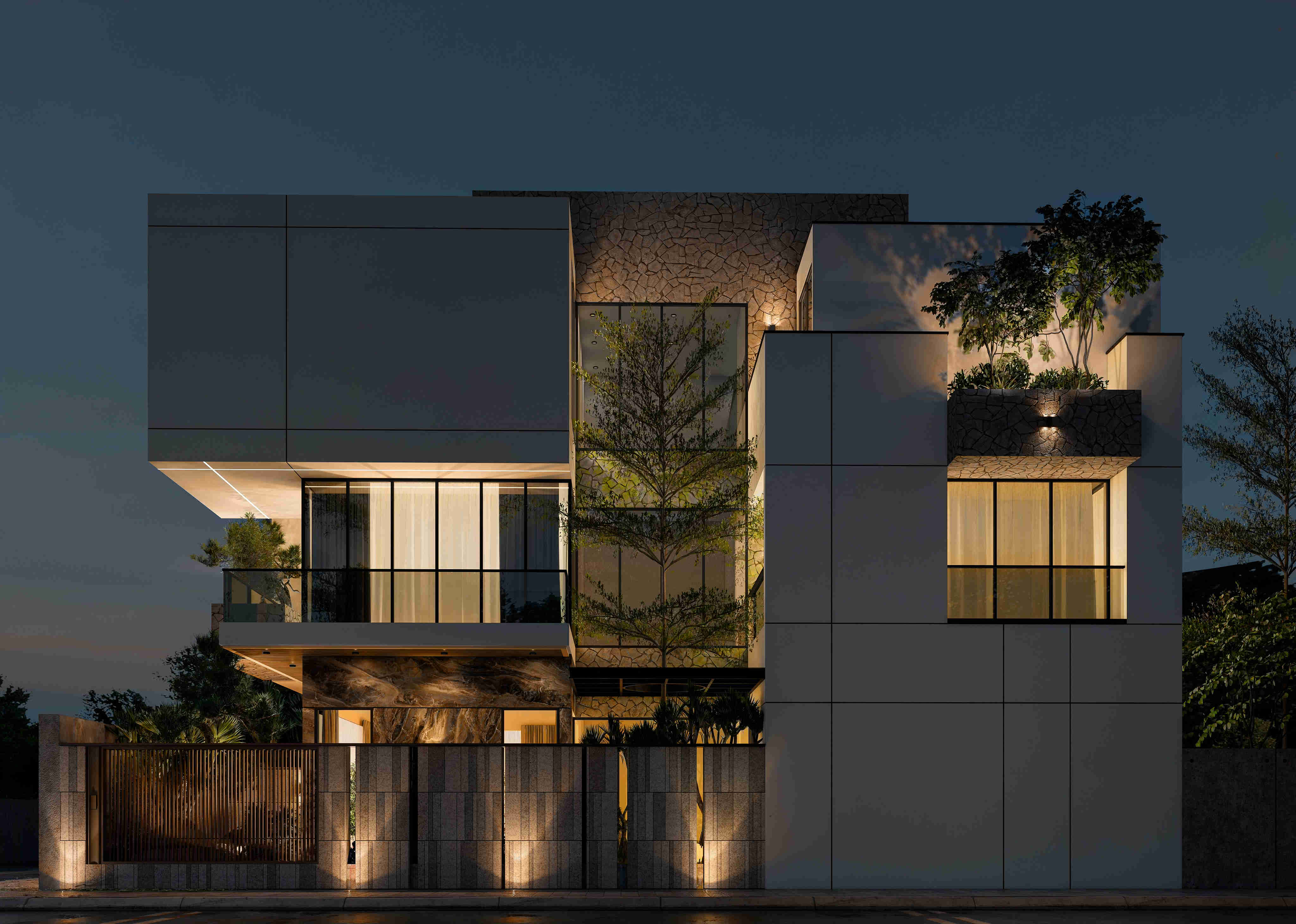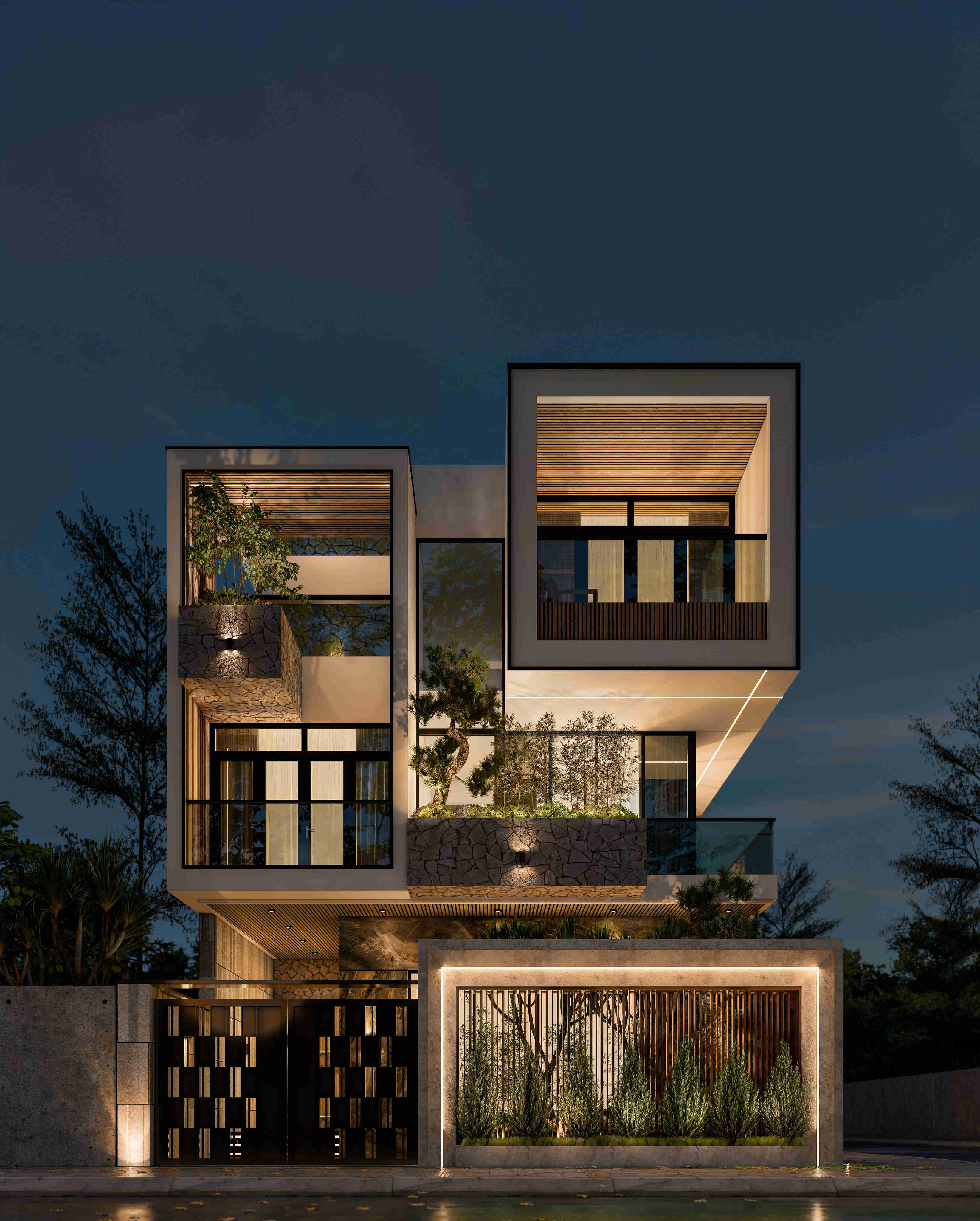 Kiến trúc của V.H Villa được thổi hồn bởi phong cách thiết kế hiện đại với các đường nét tinh giản bất đối xứng, tạo thành các khối nhà lồng ghép đầy nghệ thuật - Thể hiện phẩm chất tinh hoa, địa vị ưu tú của gia chủ.