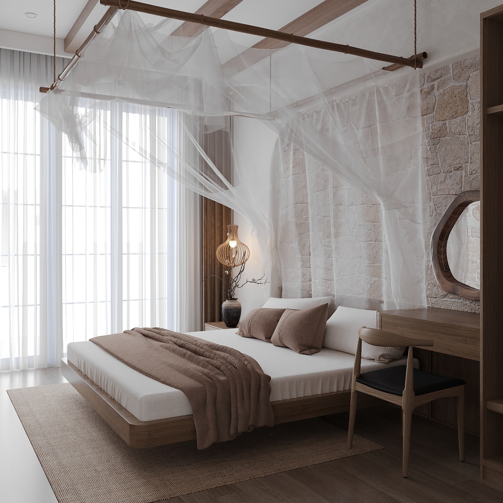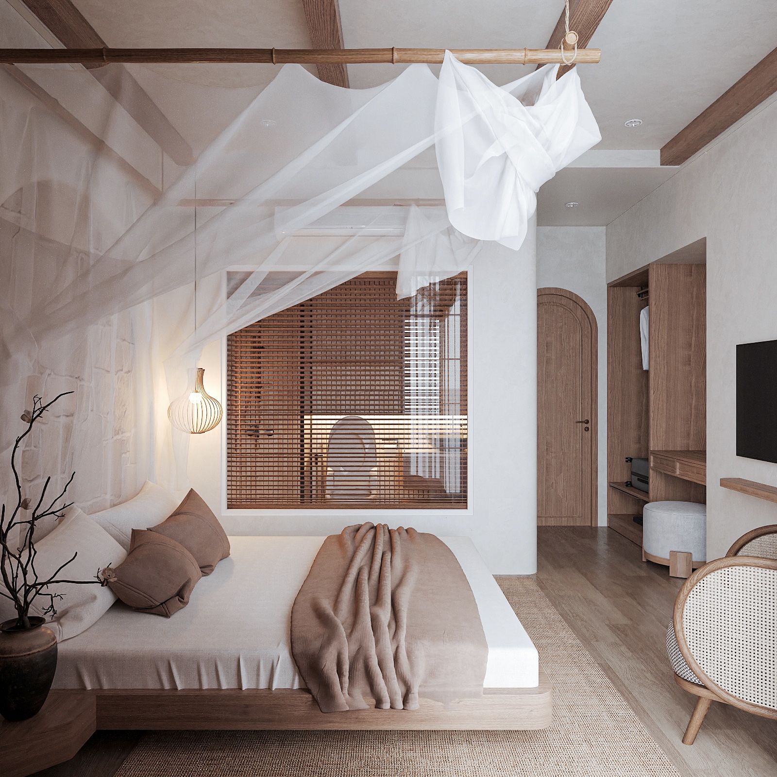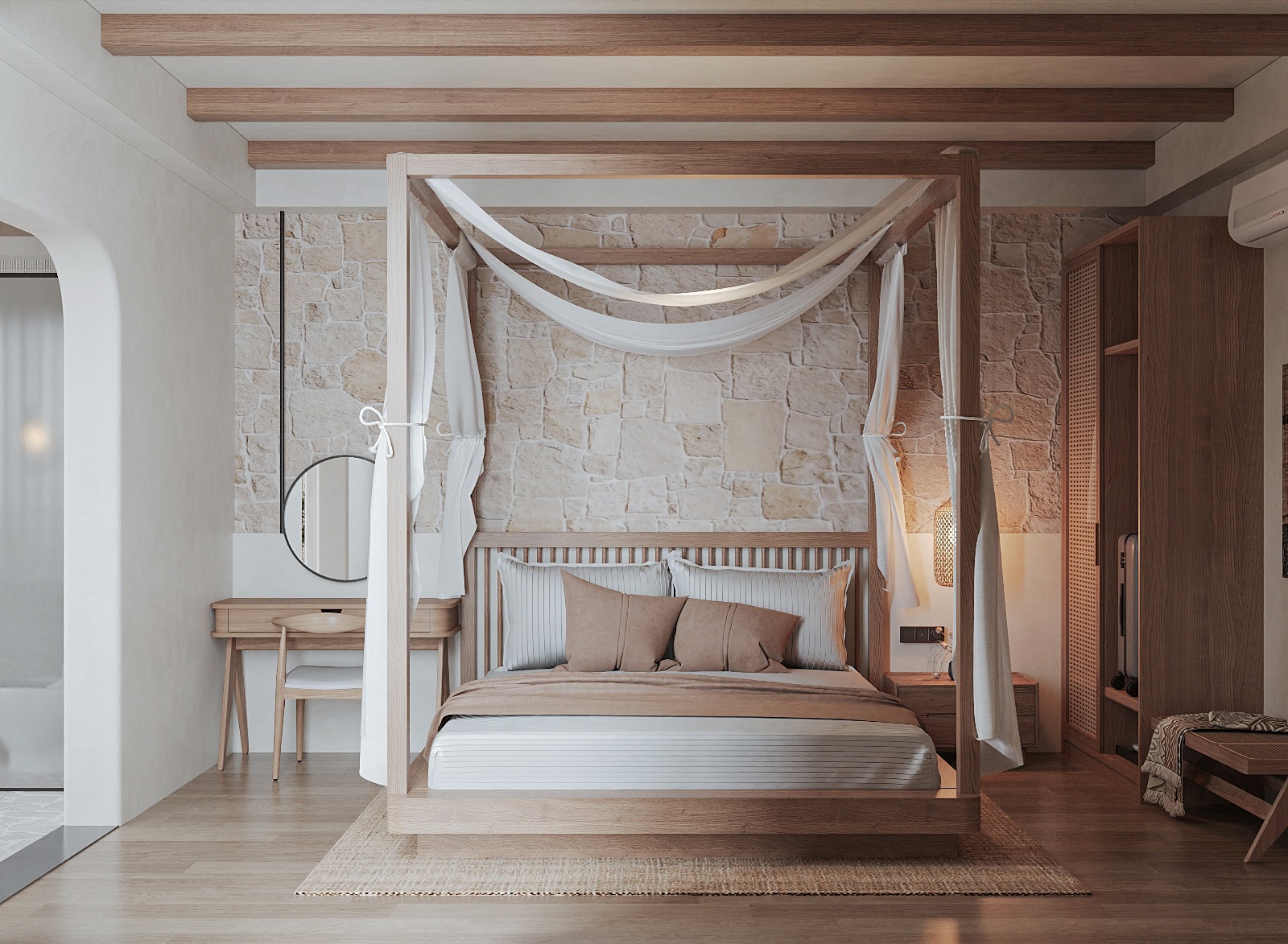 Chiếc giường bằng gỗ sồi sáng màu với rèm vải mỏng rủ mềm mại tạo cảm giác lãng mạn, bay bổng. Đây là điểm nhấn chính, mời gọi sự nghỉ ngơi tuyệt đối.