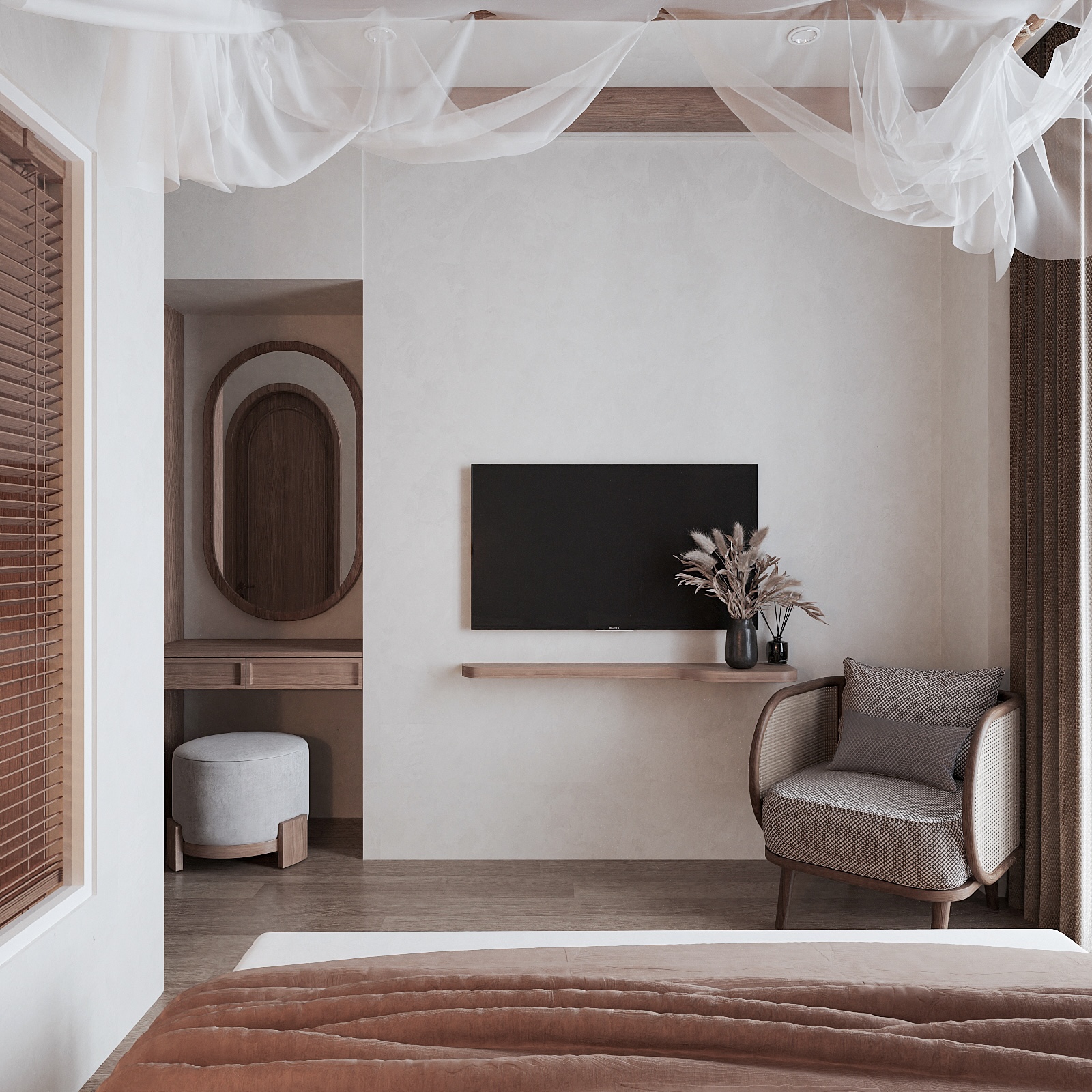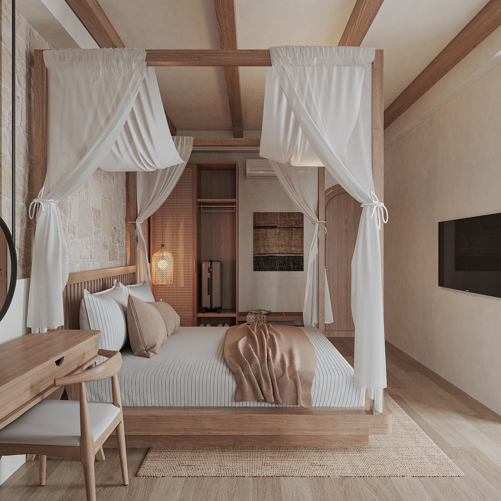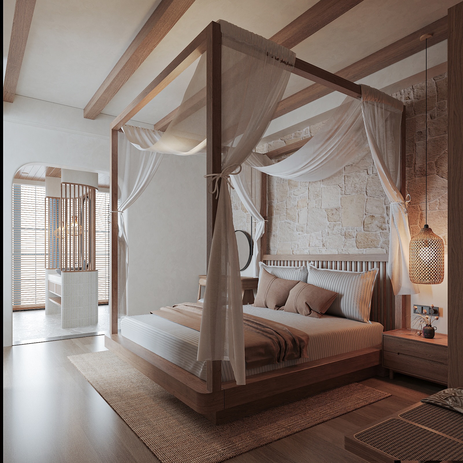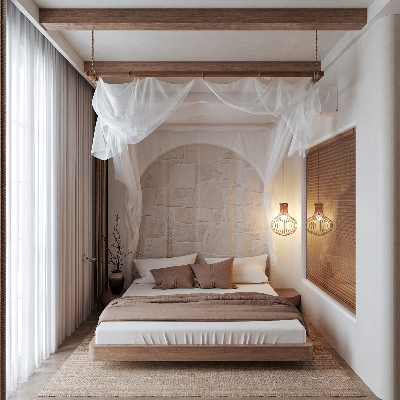 Chiếc giường bằng gỗ sồi sáng màu với rèm vải mỏng rủ mềm mại tạo cảm giác lãng mạn, bay bổng. Đây là điểm nhấn chính, mời gọi sự nghỉ ngơi tuyệt đối.