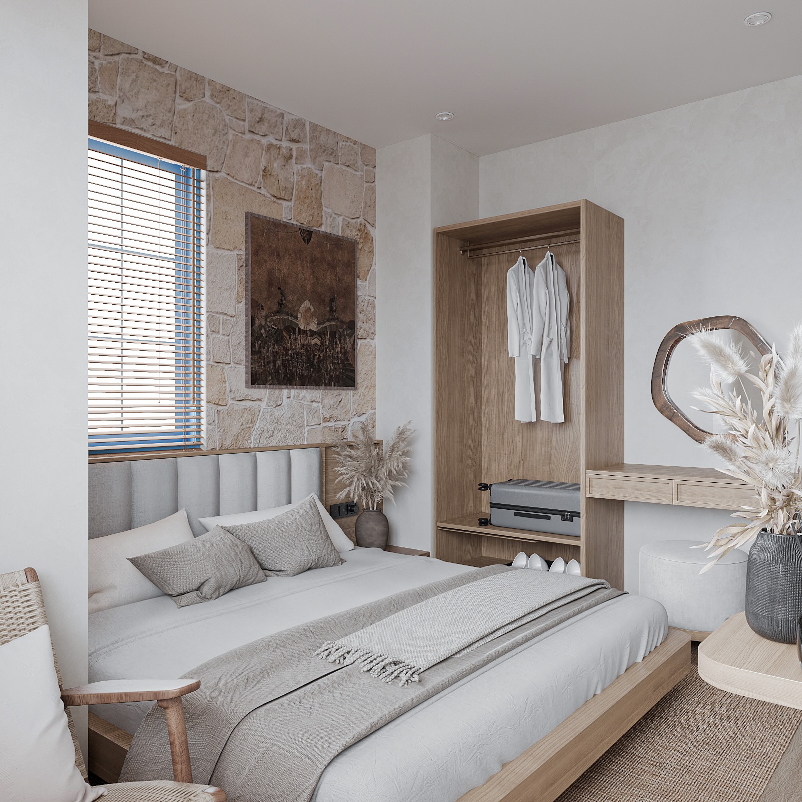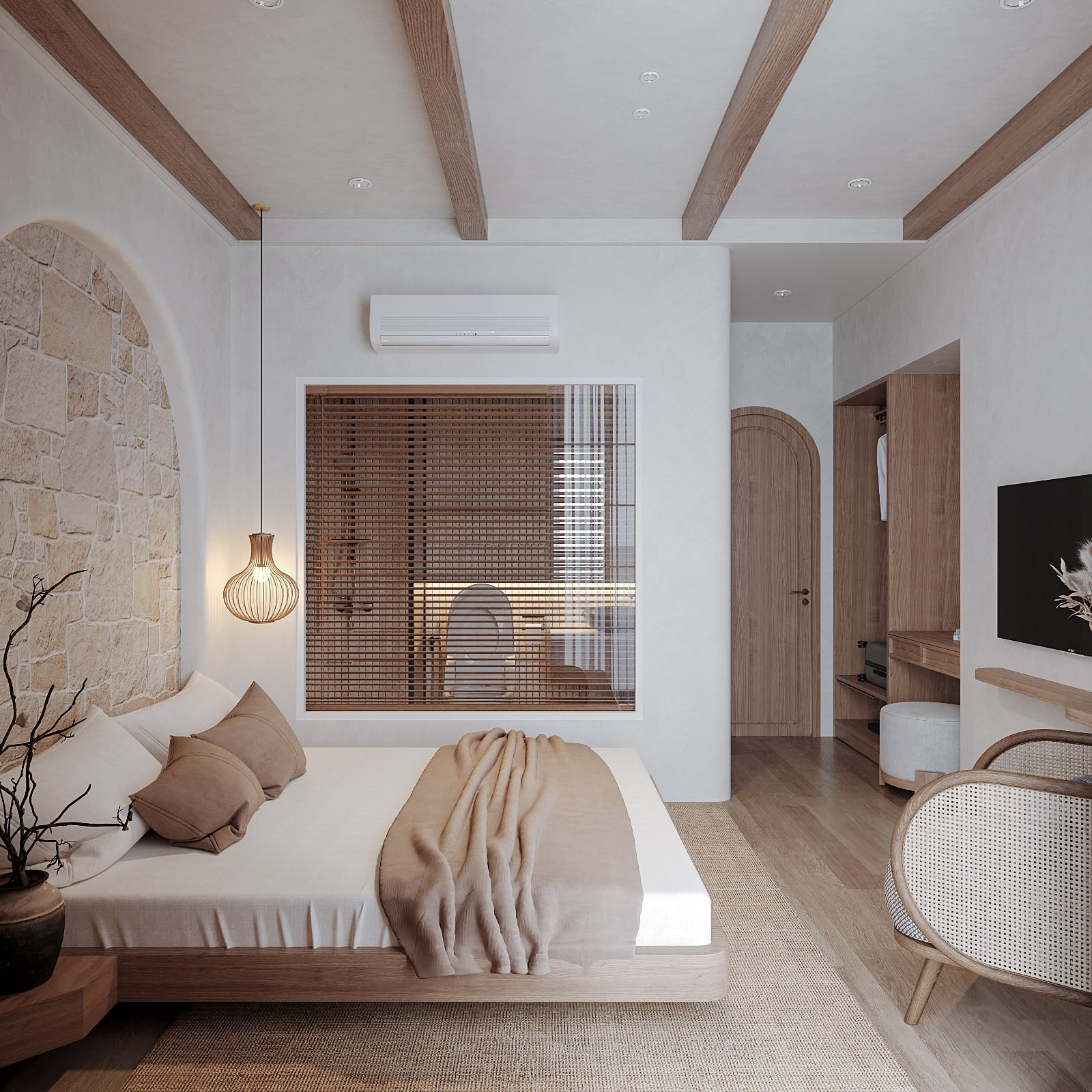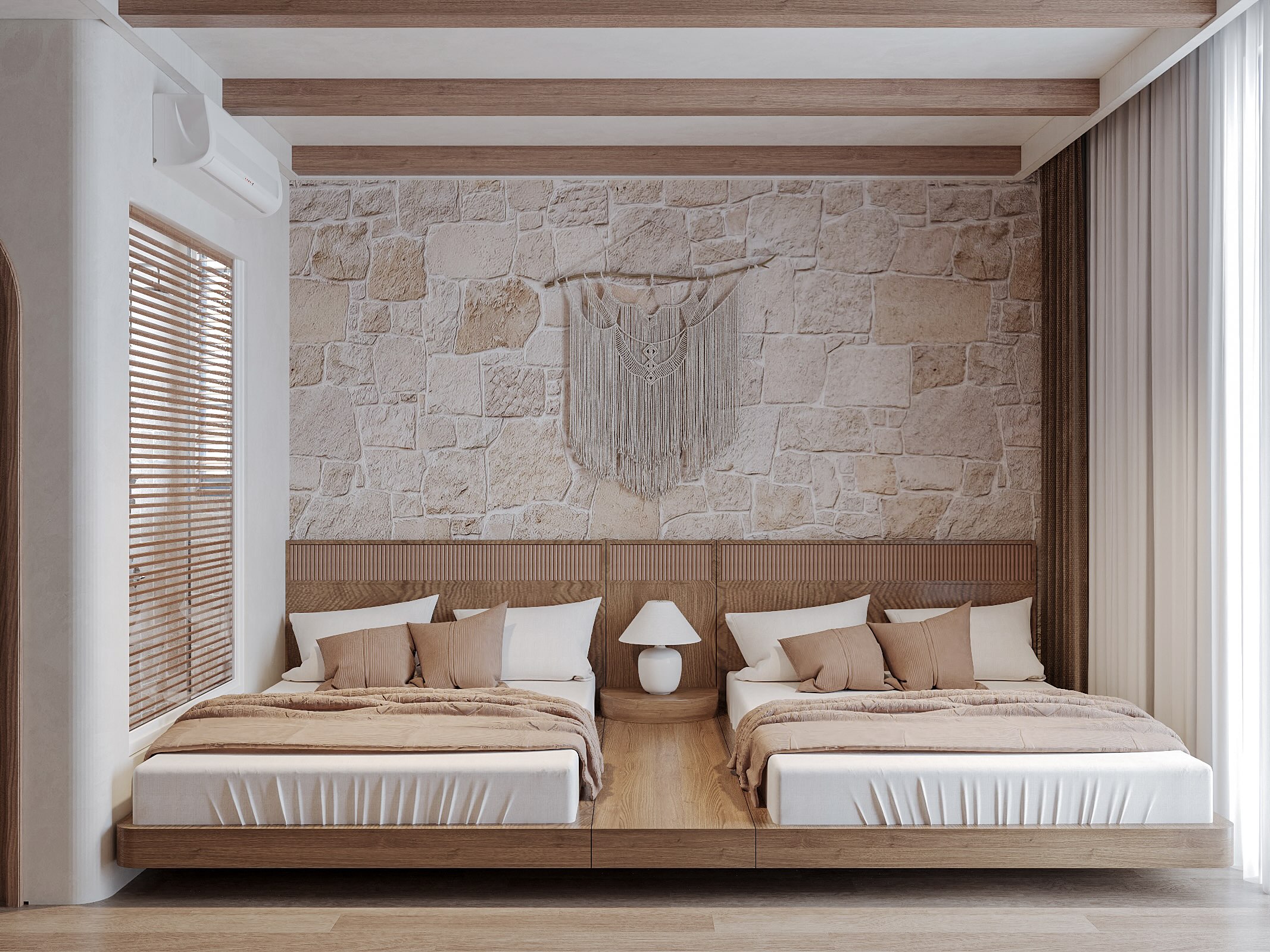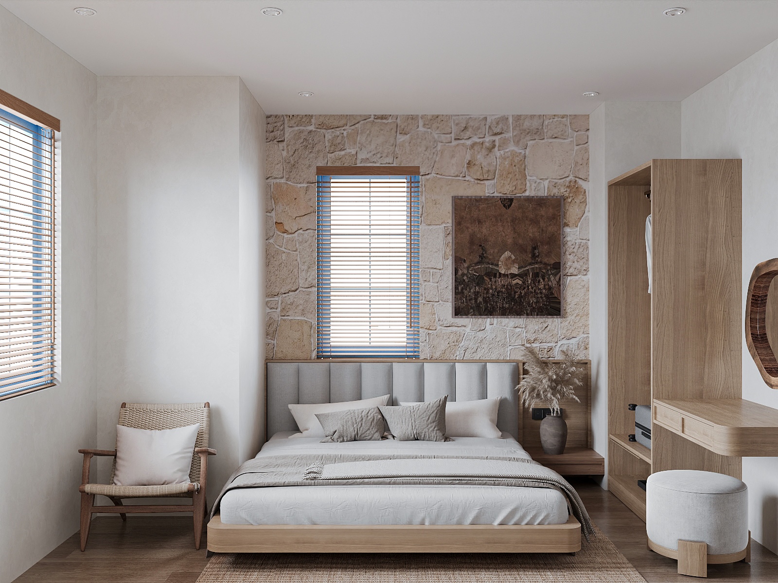Một điểm nhấn độc đáo là mảng tường đầu giường được ốp đá tự nhiên màu be nhạt, tạo kết cấu bề mặt ấn tượng và cảm giác kiên cố, gần gũi với thiên nhiên