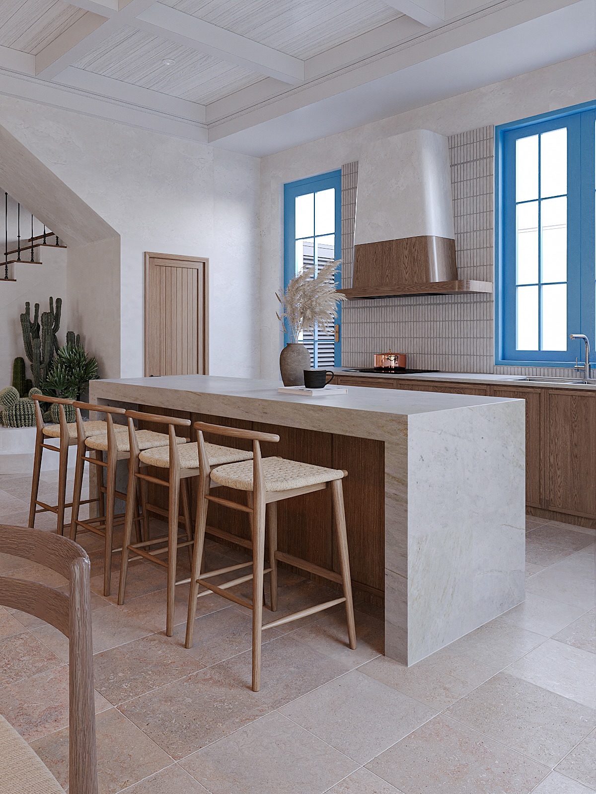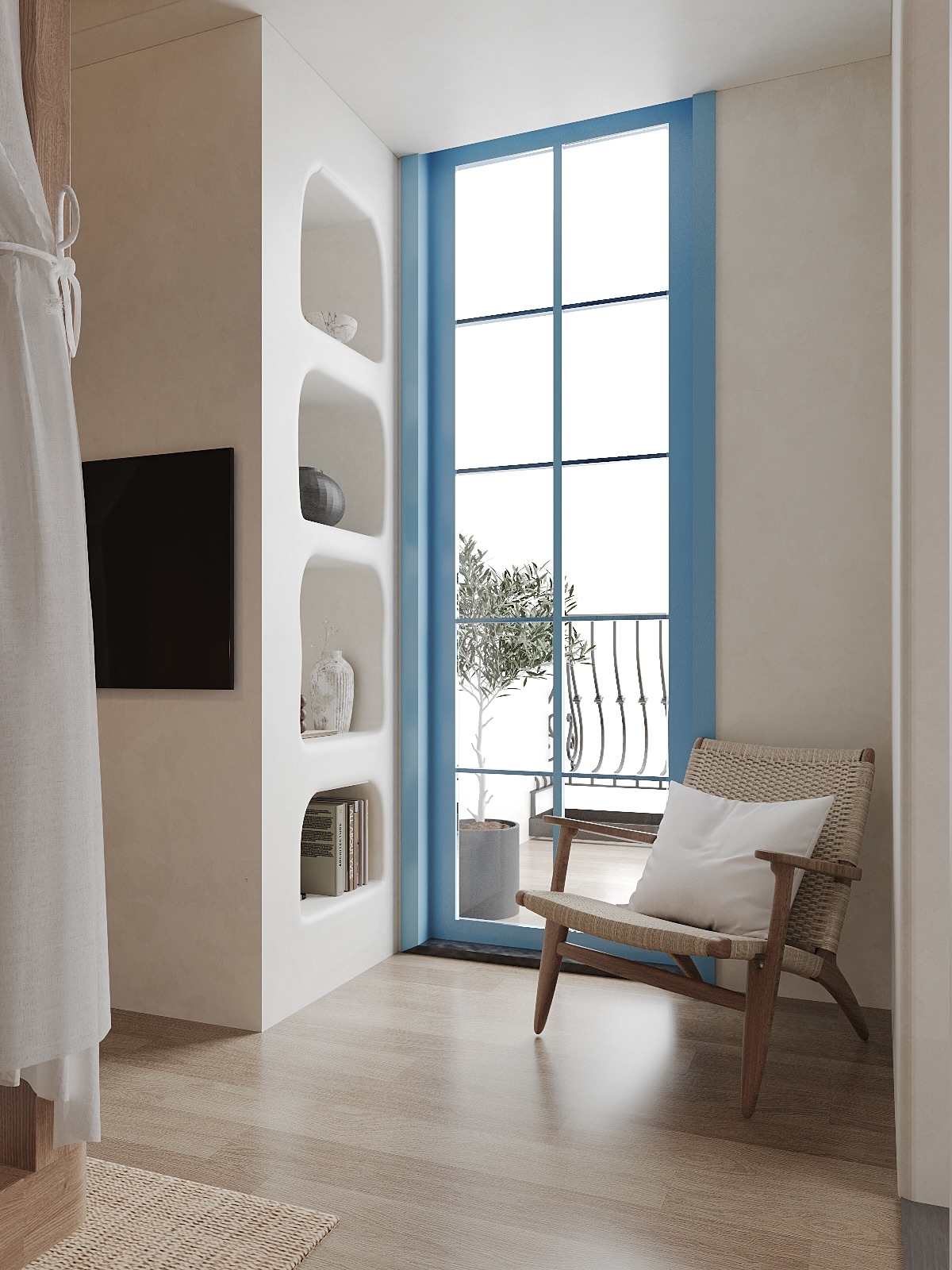 Tông màu chủ đạo là trắng, be, nâu đất kết hợp với điểm nhấn xanh dương, tạo cảm giác thư thái, khoáng đạt như một ốc đảo ven biển.