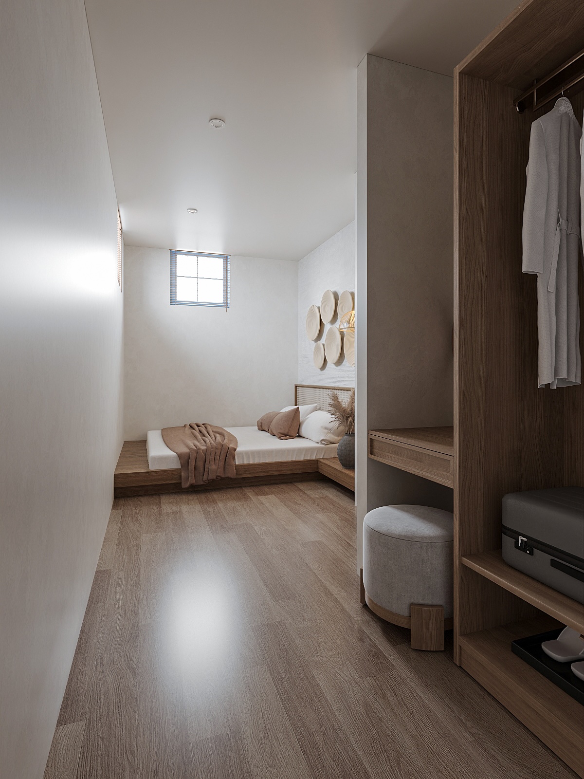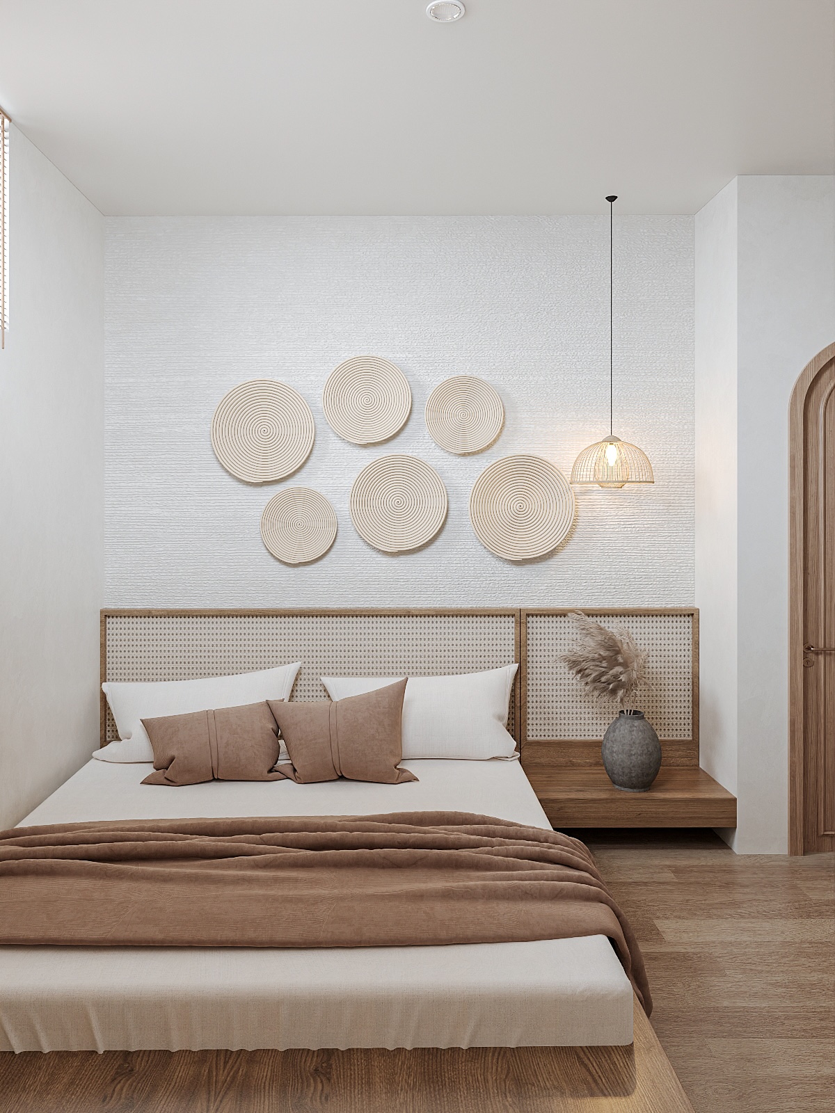 Giường ngủ có thiết kế thấp, đơn giản làm từ gỗ tự nhiên sáng màu, tạo cảm giác rộng rãi và hiện đại.