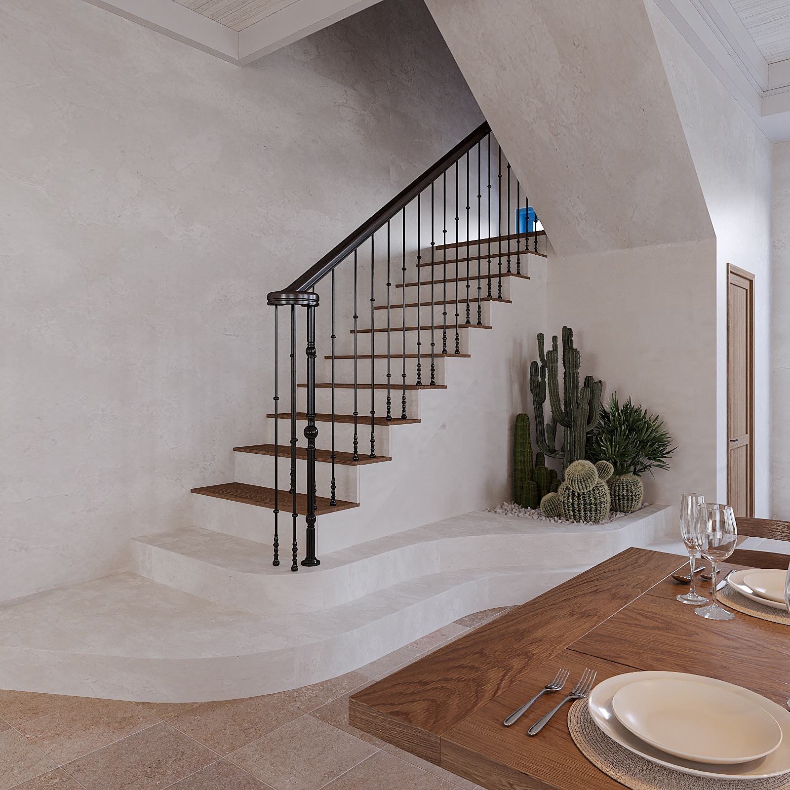 Cầu thang được làm từ vật liệu đá màu trắng be. Lan can sắt rèn màu đen với các chi tiết uốn lượn tinh xảo là điểm nhấn cổ điển, đối lập với sự mộc mạc của tường vữa.