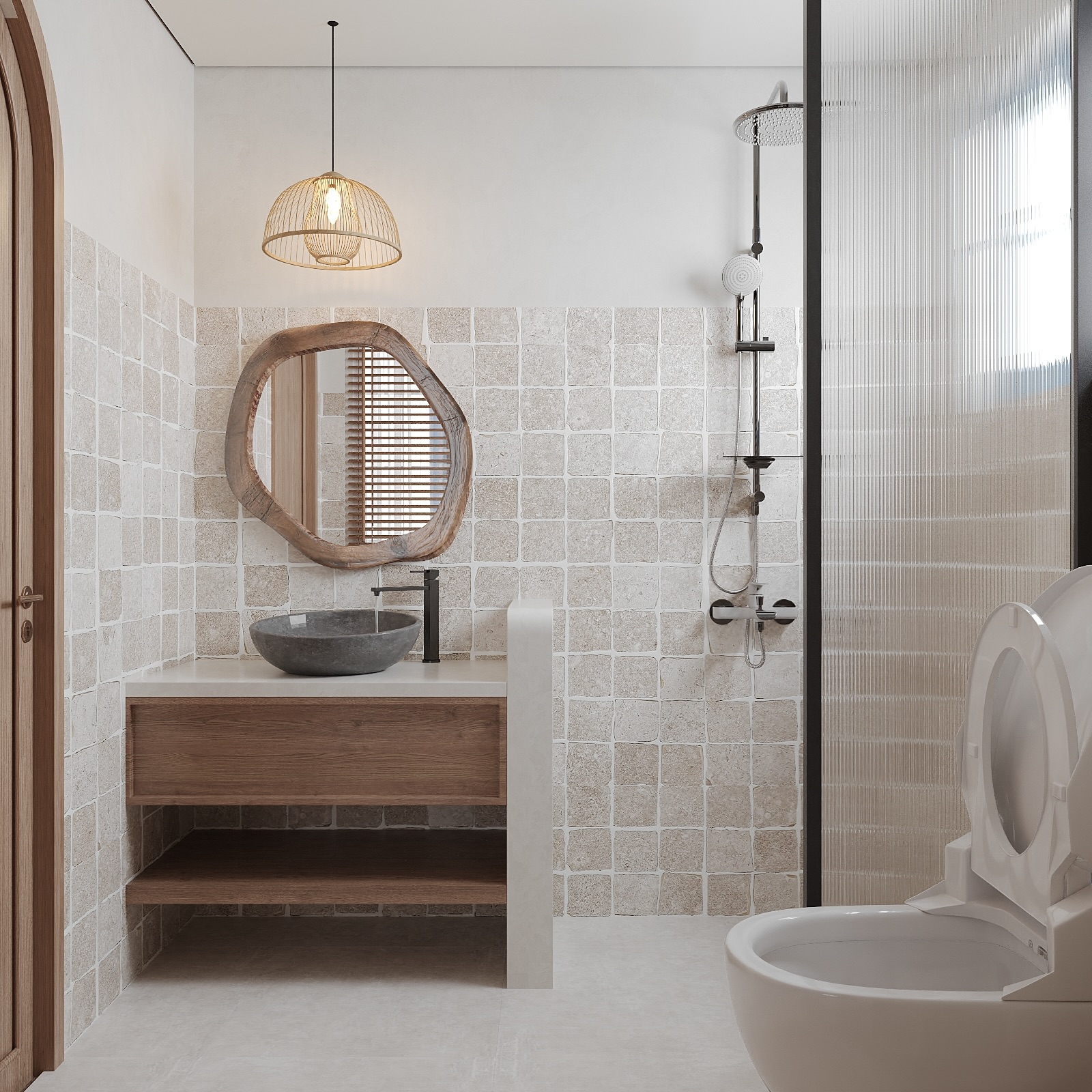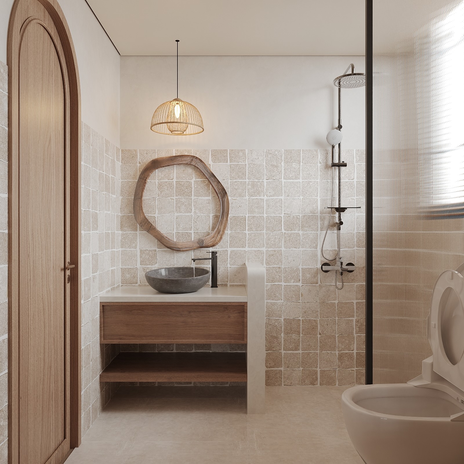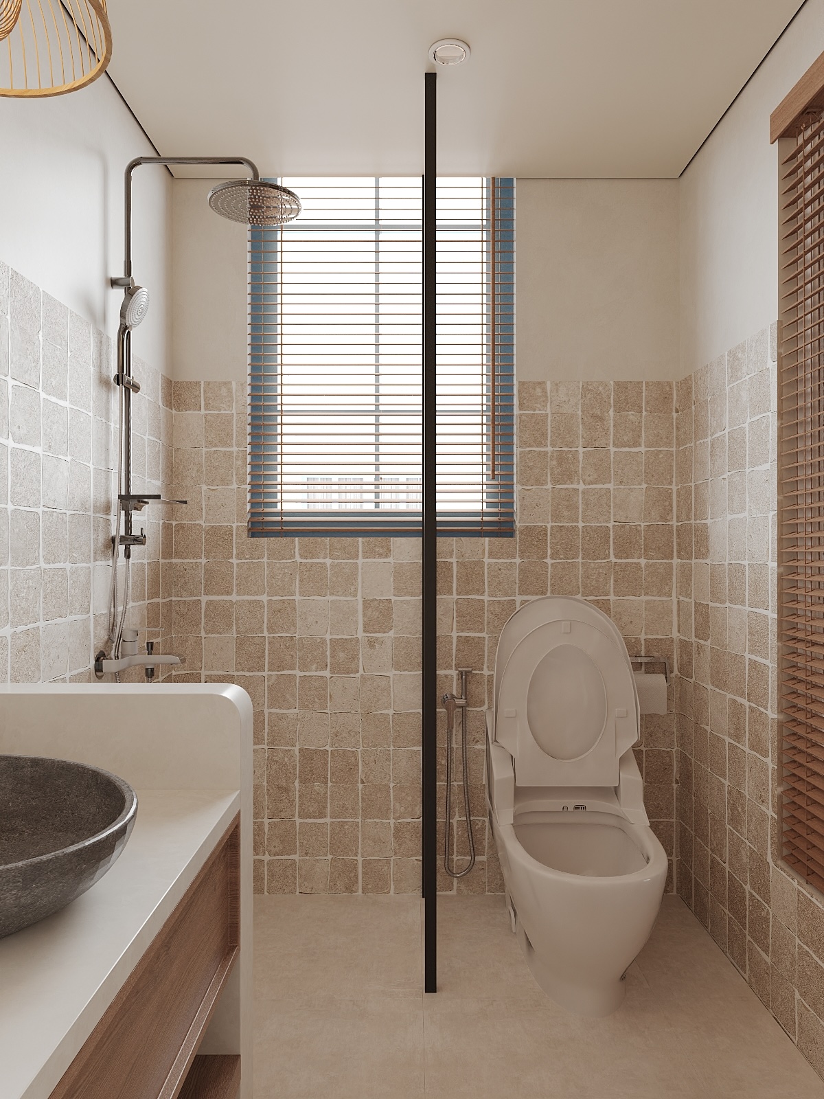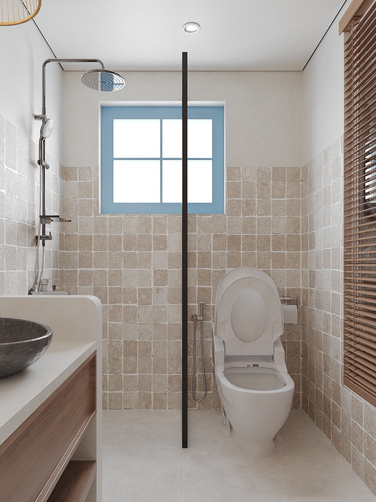 Tuy mang hơi hướng mộc mạc, các phòng tắm vẫn đảm bảo sự tiện nghi và tinh gọn của lối sống hiện đại.