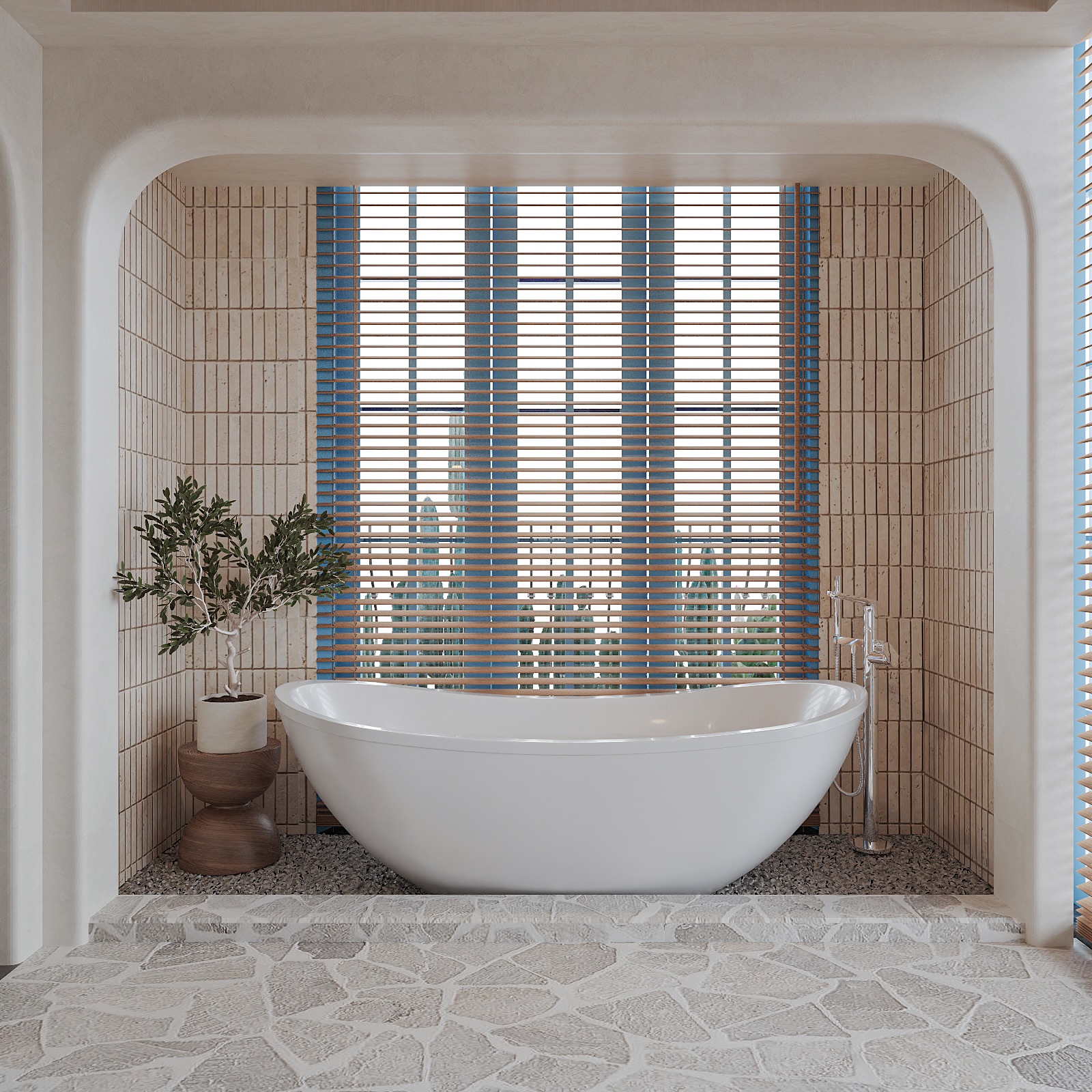 Thiết kế bồn tắm cực kỳ ấn tượng trong hốc tường hình vòm, sử dụng gạch thẻ ốp dọc màu be, xung quanh bồn tắm thả đầy đá cuội nhỏ