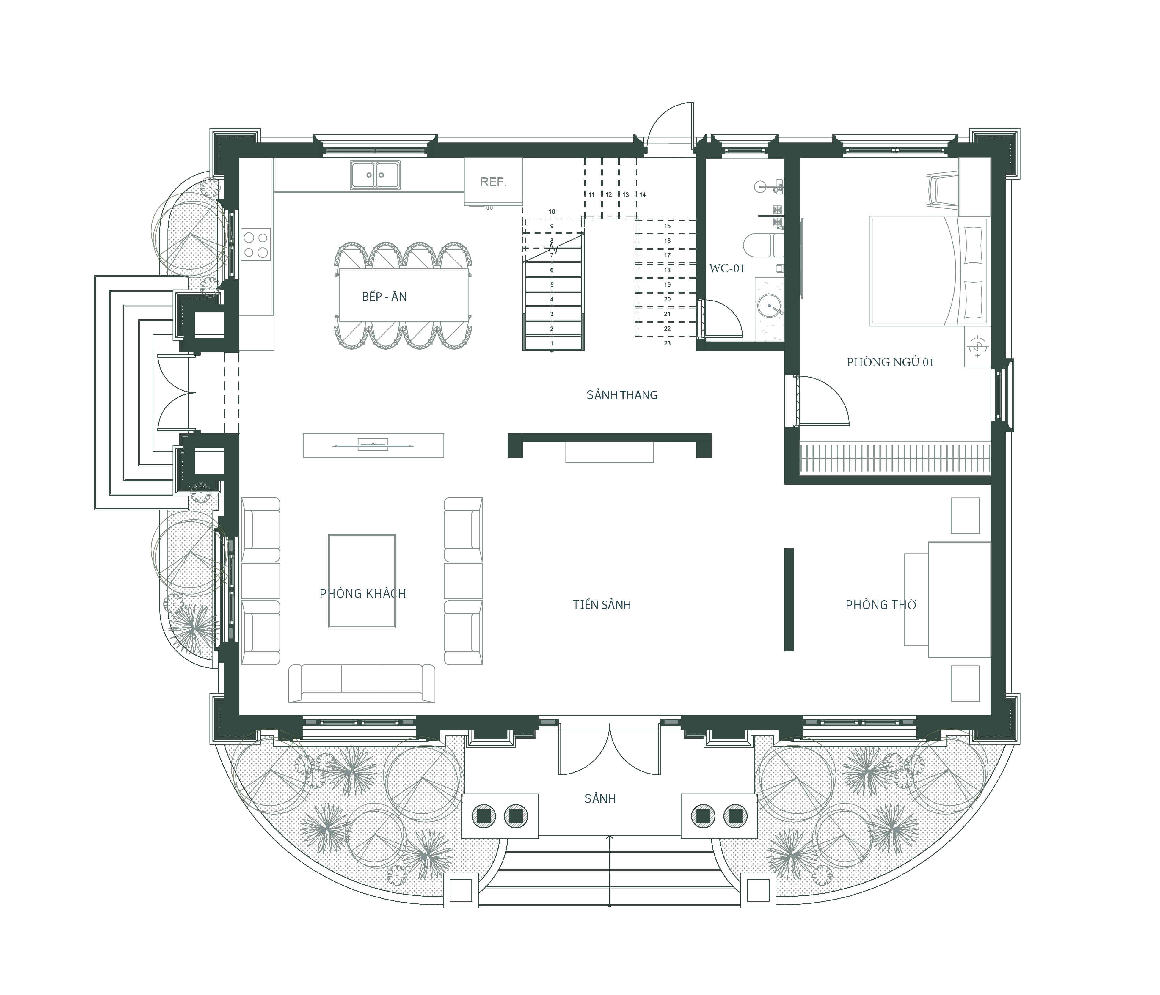 Khu vực tầng 1 với sảnh chính, tiền sảnh và sảnh thang liên tiếp nhau không chỉ tạo ra không gian thoáng đãng, thoải mái, lưu thông không khi mà còn là giải pháp phân chia công năng thông minh.