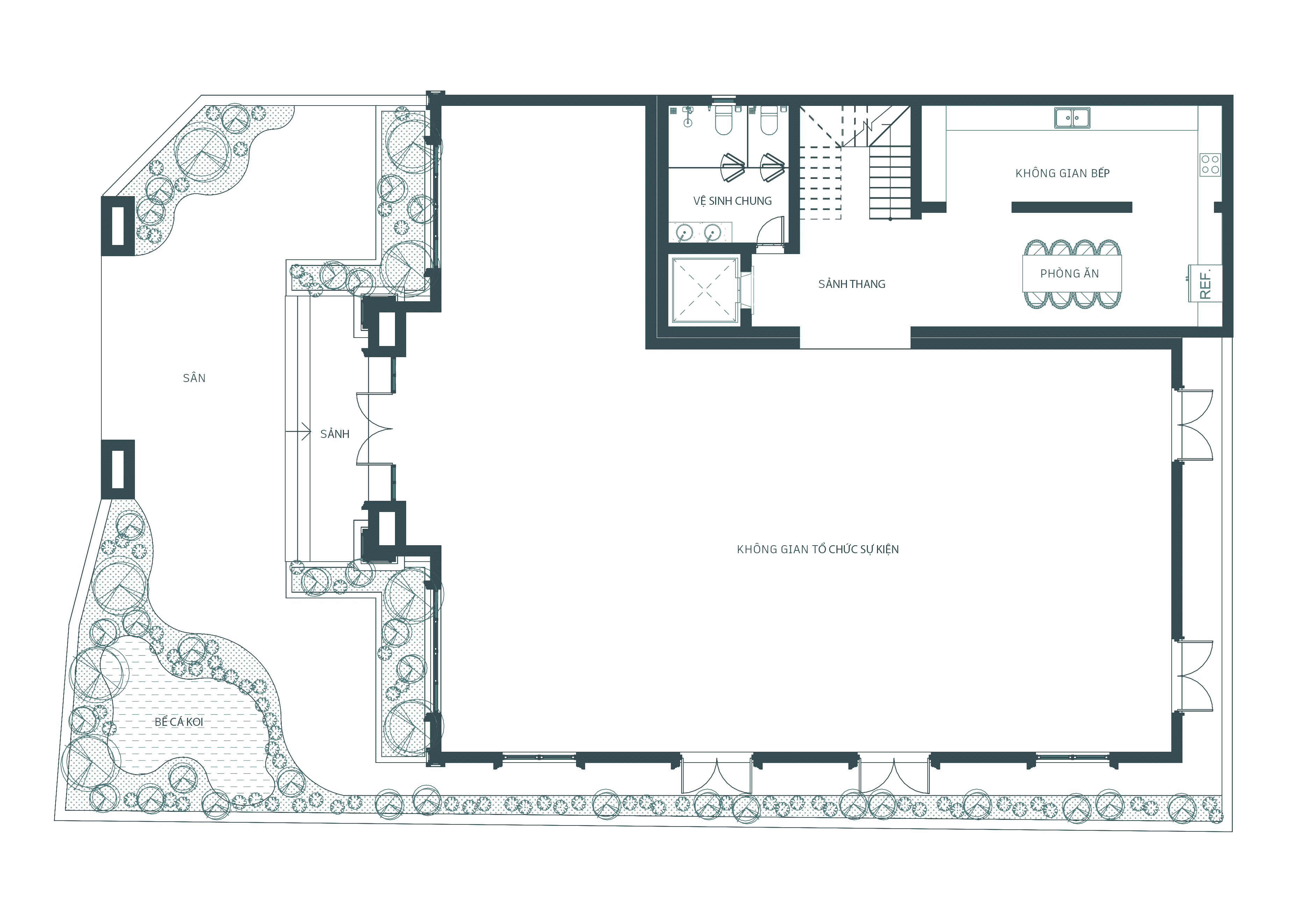 Hệ thống cửa kính mái vòm đầy nét hoài cổ châu Âu được sử dụng, đồng thời cũng tạo độ mở cho không gian tổ chức sự kiện ở tầng 1.