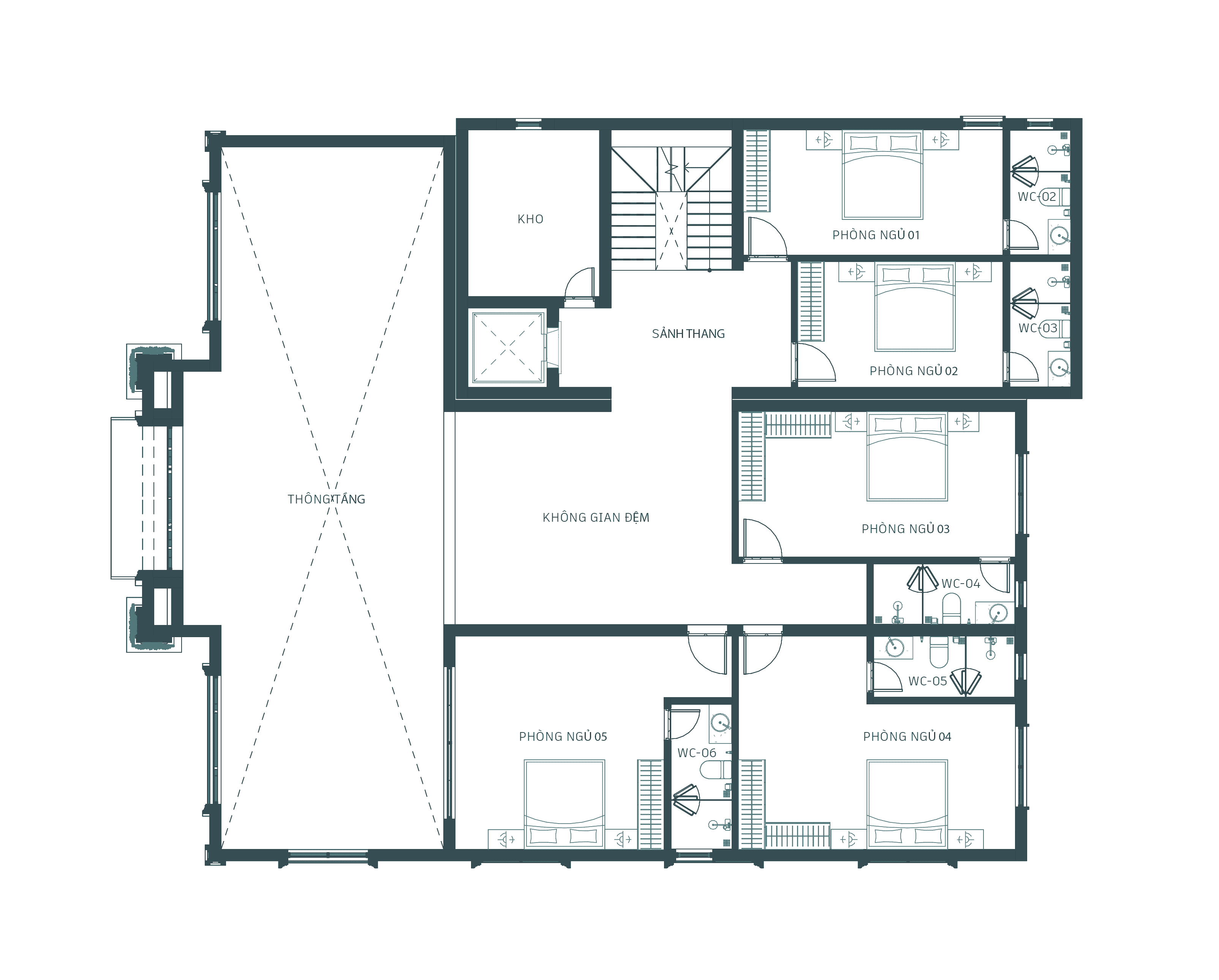 Toàn bộ 5 phòng ngủ của gia đình được bố trí tại tầng 2 với khoảng thông tầng rộng rãi.