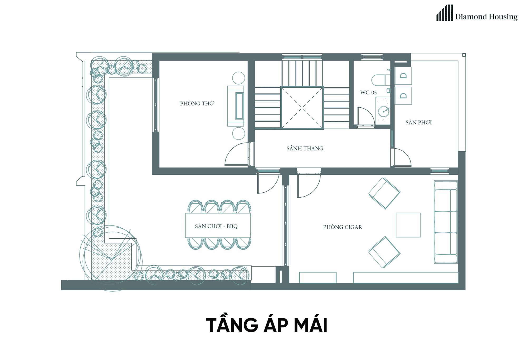 Dựa trên mong muốn của gia chủ, khu vực tầng 3 được Diamond Housing đáp ứng các nhu cầu riêng của gia đình như phòng hút thuốc, khu vực BBQ và khu vực thờ cúng gia tiên.