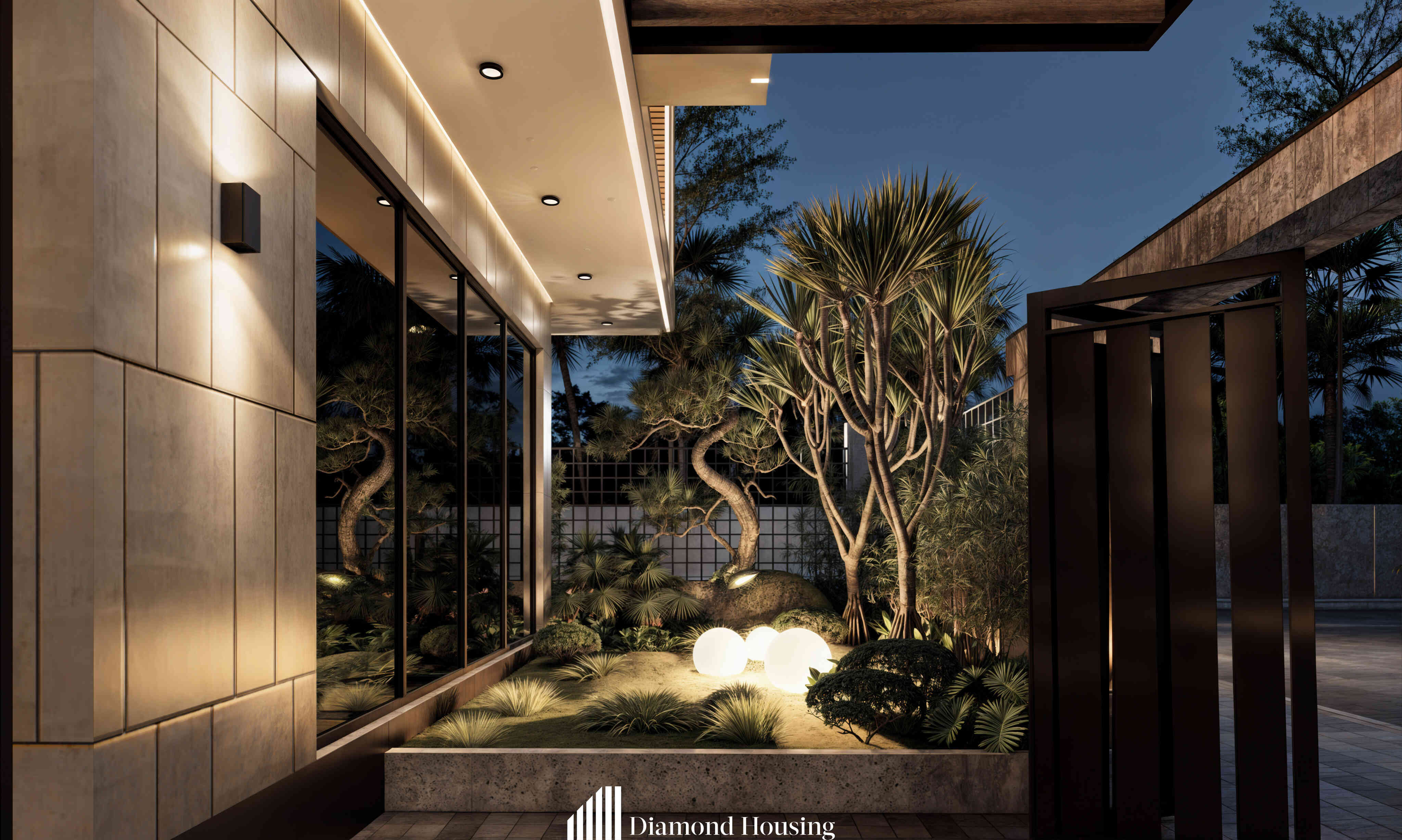 Ánh sáng nhân tạo cũng được sử dụng cho các khu vực cây xanh trong villa