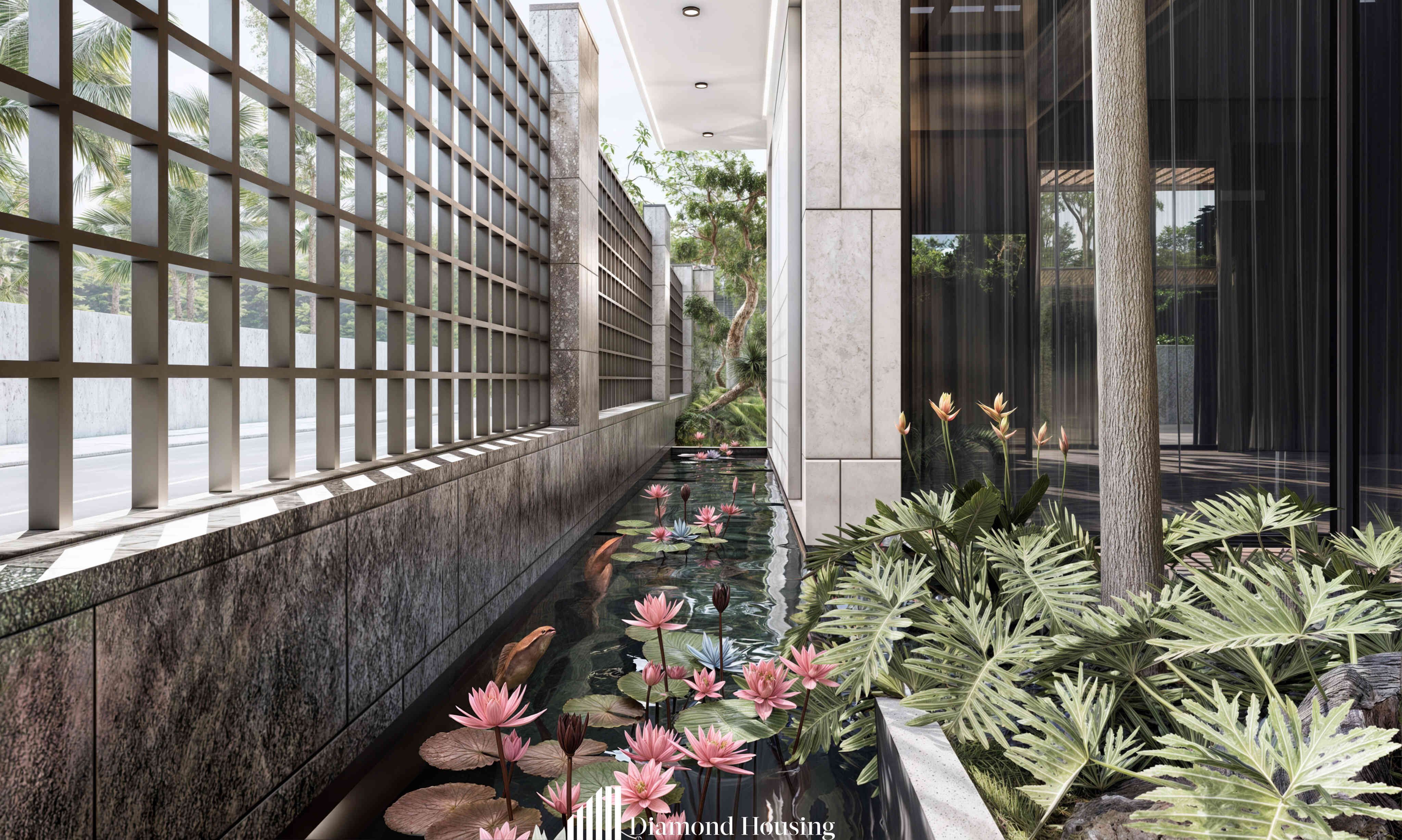 Khu vực hồ nước hình chữ nhật hẹp tạo ấn tượng thị giác mạnh mẽ và cực kì sang trọng