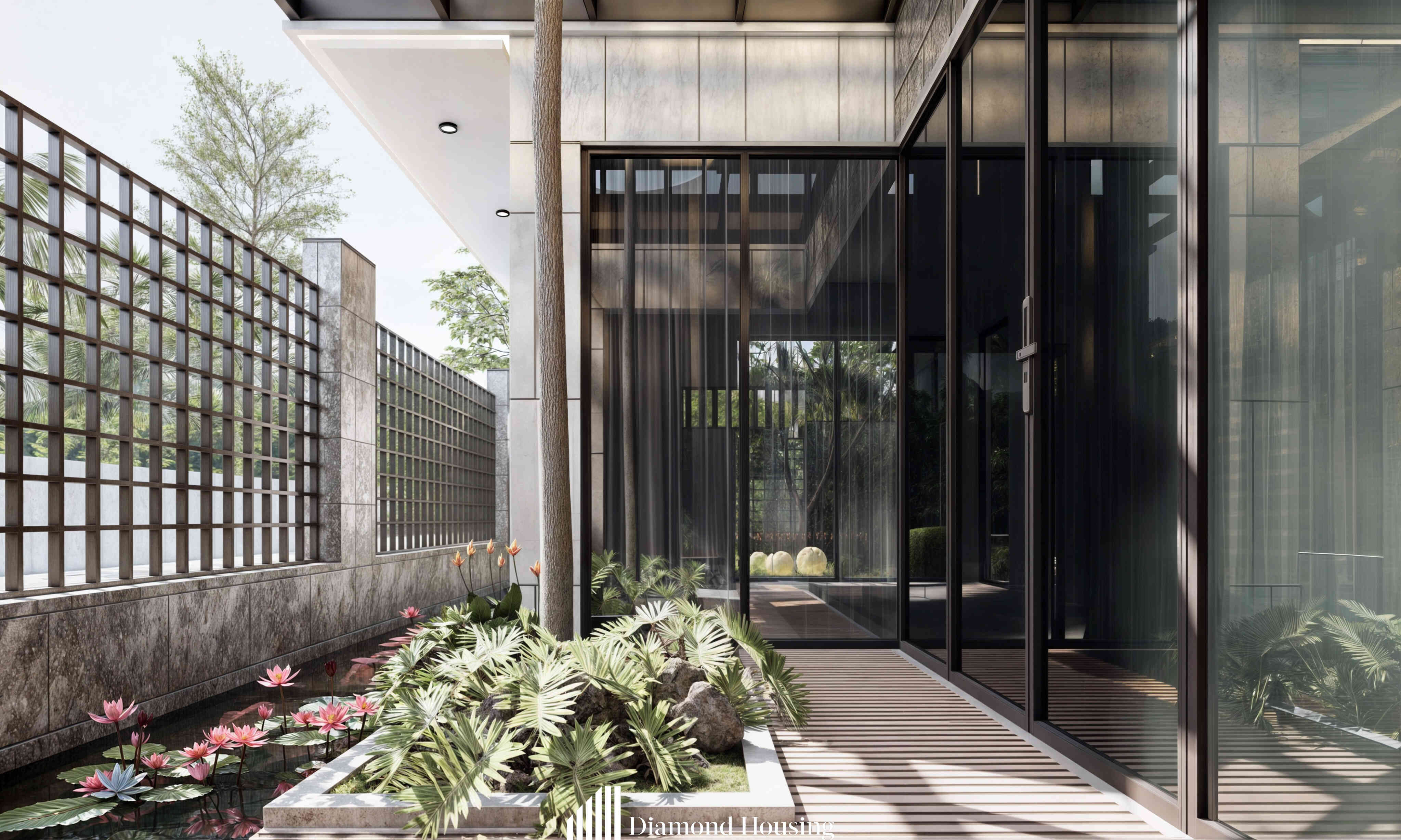 Một mặt tiền của villa được kết hợp với tiểu cảnh trước nhà cùng hệ thống cửa kính tạo sự kết nối