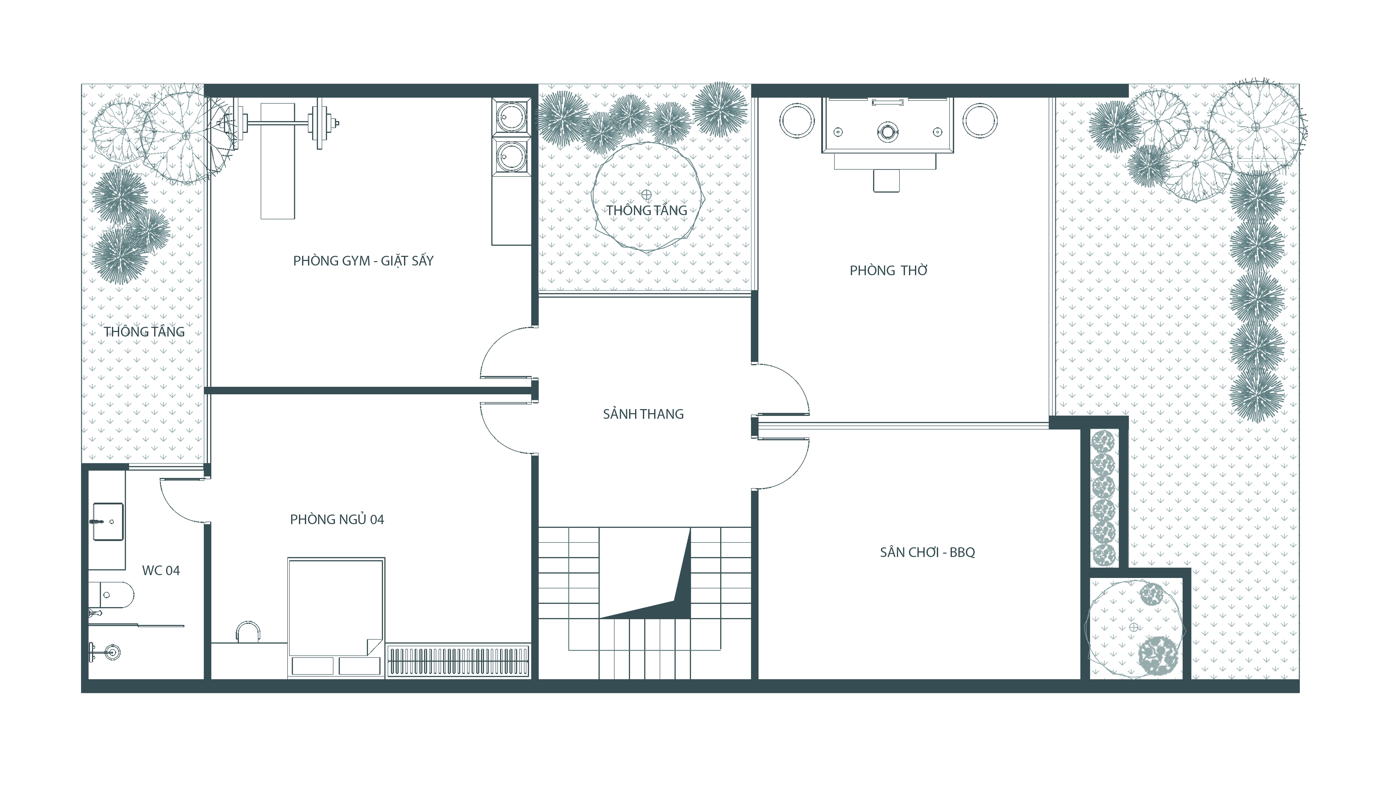 Tầng 3 là khu vực giải trí, phòng gym, BBQ và phòng thờ của gia chủ.