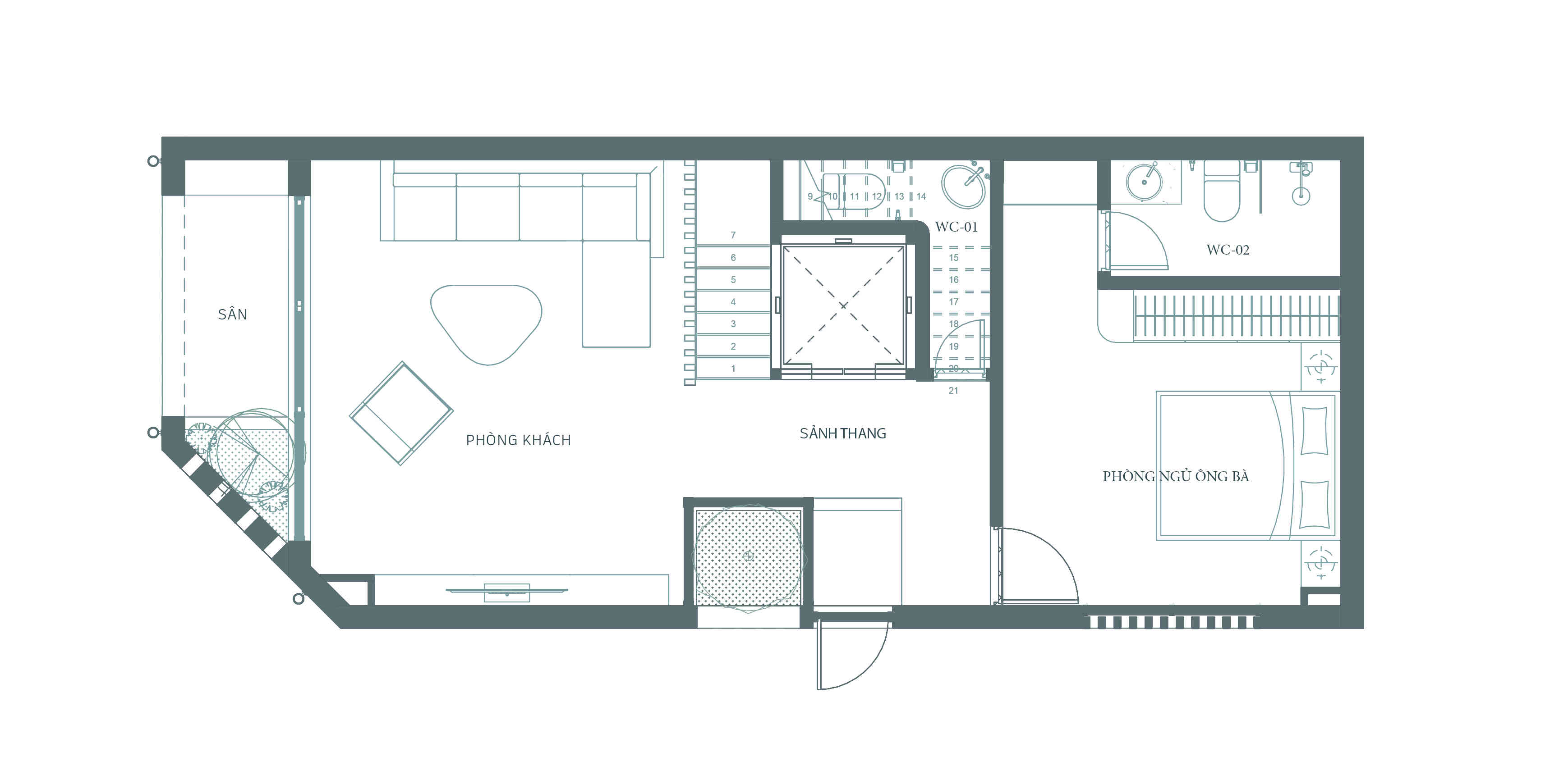 Cùng với một khoảng sân nhỏ, mặt bằng tầng 1 được bố trí một sảnh thang cùng phòng khách và phòng ngủ chờ - cách thiết kế khá quen thuộc với các công trình nhà ở.