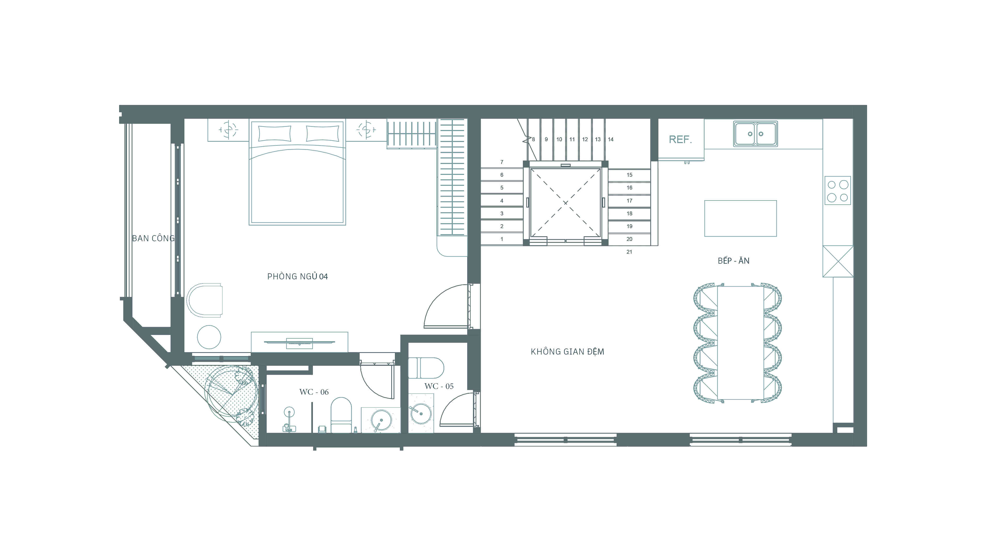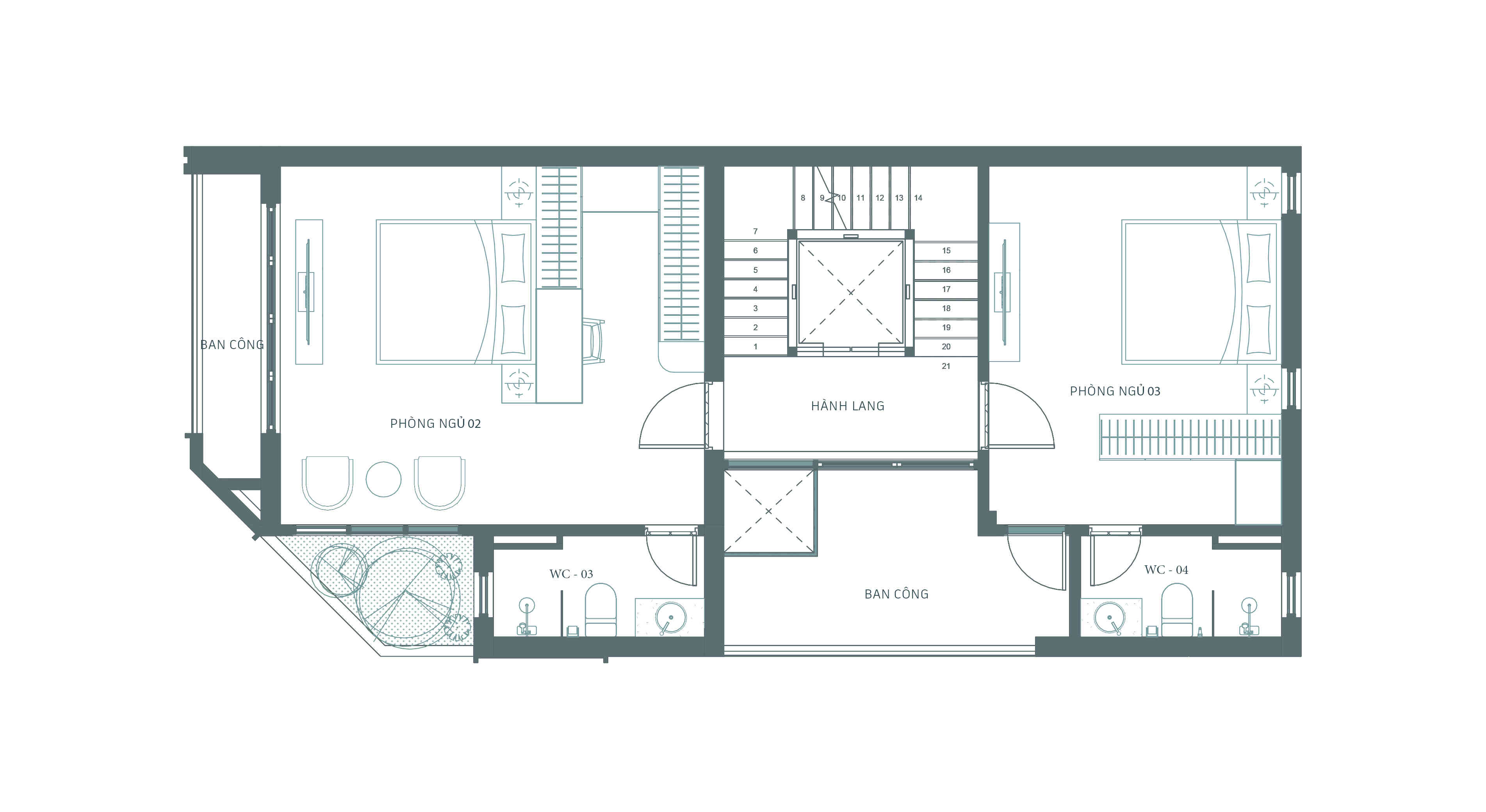 Khu vực tầng 3 với công trình phụ và phòng ngủ số 4 được sắp xếp đan xen tiếp tục với các khoảng ban công nhỏ.