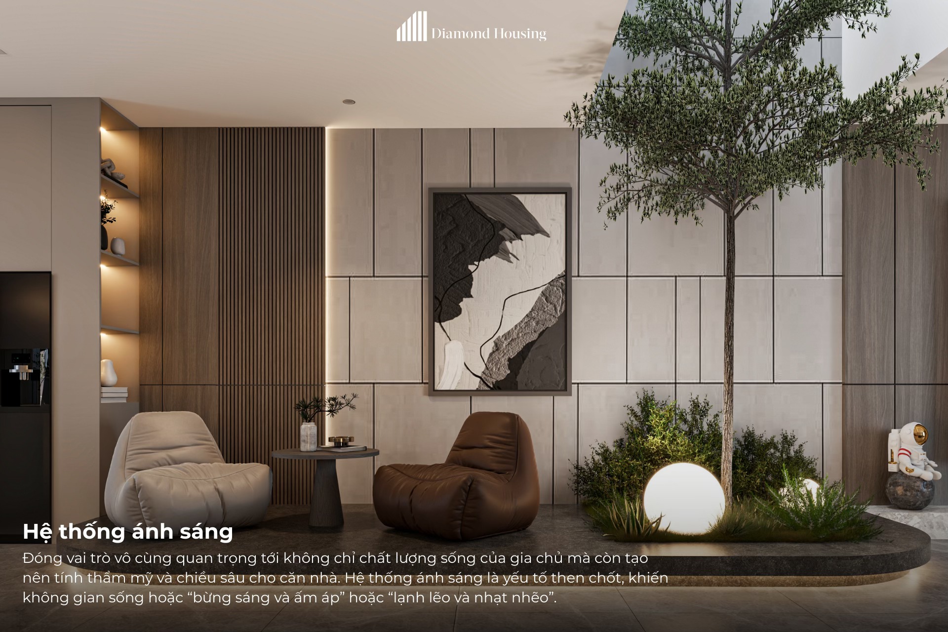 Ánh sáng không chỉ phục vụ nhu cầu sinh hoạt mà còn là yếu tố then chốt tạo nên tính thẩm mỹ và chiều sâu cho căn nhà. Một hệ thống chiếu sáng thông minh có khả năng thay đổi hoàn toàn cảm xúc của người ở.