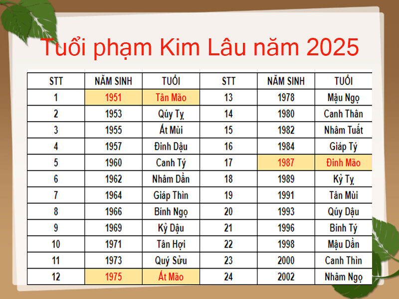 Kim Lâu là một tuổi xấu trong văn hoá tâm linh của người Việt Nam, biểu thị một năm khó khăn, không phù hợp để thực hiện các sự kiện quan trọng như xây dựng nhà cửa, kết hôn hay quản lý gia đình. Danh sách các tuổi phạm Kim Lâu 2025 như sau: